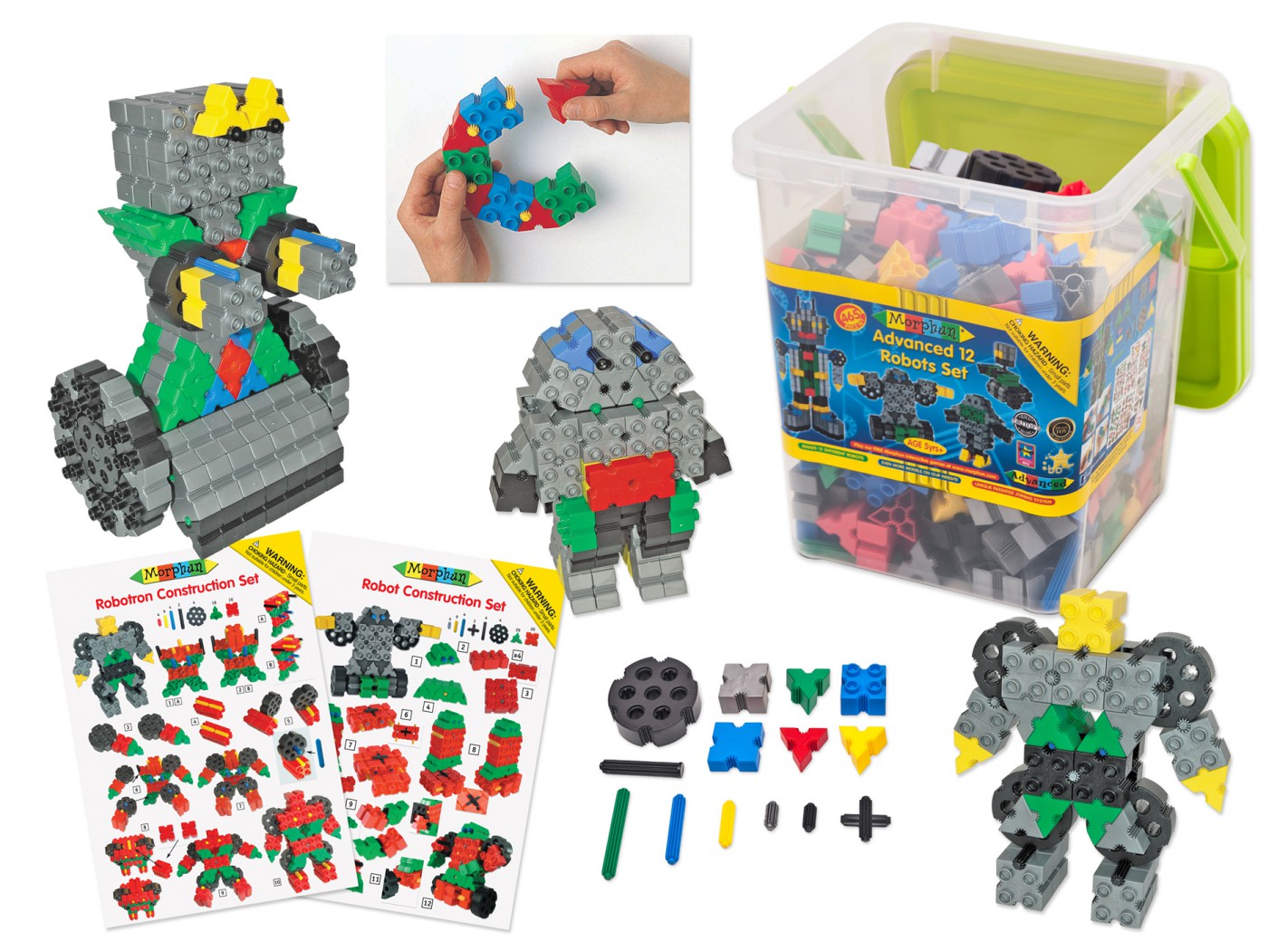 Конструктор упакован в ударопрочный прозрачный пластиковый короб с крышкой и удобной ручкой для переноски и хранения деталей.