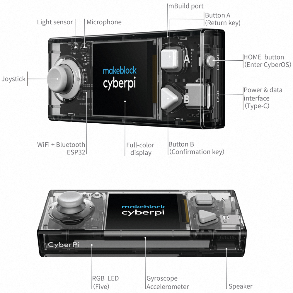 CyberPi - это программируемый беспроводной контроллер, предназначенный для обучения основам искуственного интеллекта (AI), основам интернета вещей (IoT) и программированию на языке Python. При компактном размере контроллер, оснащен полноцветным дисплеем, несколькими устройствами ввода, независимо разработанной системой CyberOS, большим объёмом памяти и набором модулей и датчиков. С контроллером CyberPi и средой mBlock легко обучаться программированию, двигаясь от базового визуального программирования к высокоуровневому на языке Python. CyberPi с высокопроизводительной платой расширения Pocket Shield расширяет возможности проектной деятельности. Плата расширения Pocket Shield расширяет возможности CyberPi. Она поставляется с перезаряжаемой высокопроизводительной литий-ионной батареей (800 мАч) внутри, 2 портами для двигателей постоянного тока и 2 сервопортами. Сервопорты могут подключаться к светодиодным лентам, цифровым и аналоговым датчикам Arduino. Также, на Pocket Shield находится выключатель питания.