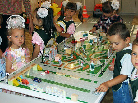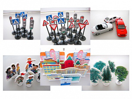 Настольно-напольная игра представляет собой макет, состоящий из трех магнитно-маркерных панно, на которых изображена городская инфраструктура, пригород и автогородок.