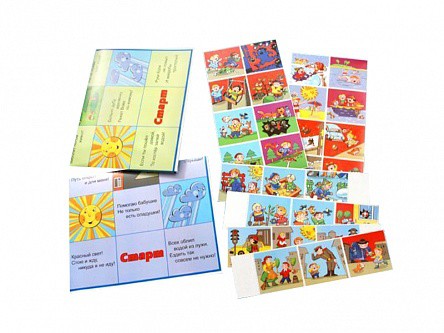 Развивающая игра представляет собой набор из игровых полей, на которых в стихотворной форме представлены правила безопасного поведения во время прогулки, карточек с изображениями ситуаций, в которых эти правила применяются, разноцветных фишек и игрального кубика.