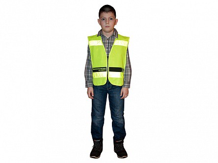 Световозвращающий жилет представляет собой одежду без рукавов желтого цвета на молнии с четырьмя световозвращающими полосками. На спине жилета нанесены рисунок и слоган. По бокам расположены эластичные ленты черного цвета, которые позволяют варьировать жилет по размеру для детей разного возраста и телосложения.