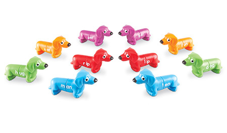 Красочные щенки со слогами на боку. Щенята хватаются друг за друга и раздвигаются, чтобы вы смогли собрать слова из разных половинок.
