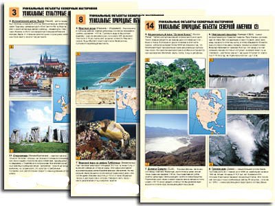 Комплект таблиц по географии "Уникальные объекты северных материков" раздаточные (цветные, ламинированные, А4, 16 штук)