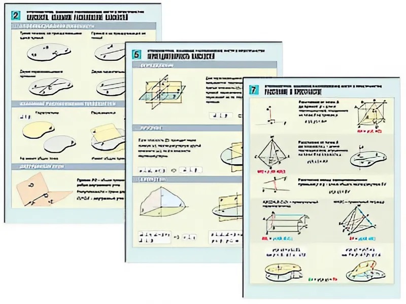 Комплект таблиц по геометрии "Стереометрия. Взаимное расположение фигур в пространстве" раздаточные (цветные, ламинированные, А4, 8 штук)