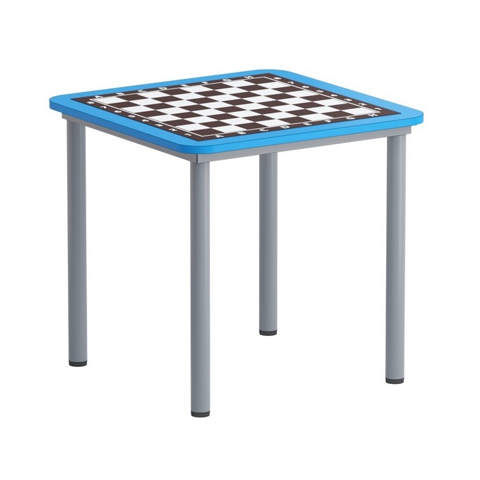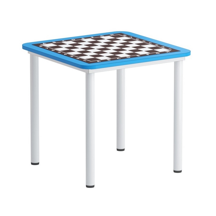 Стол шахматный на металлокаркассе, цвет ЛДСП и кромка: синий, м/к - белый или серый, кромка - синяя.