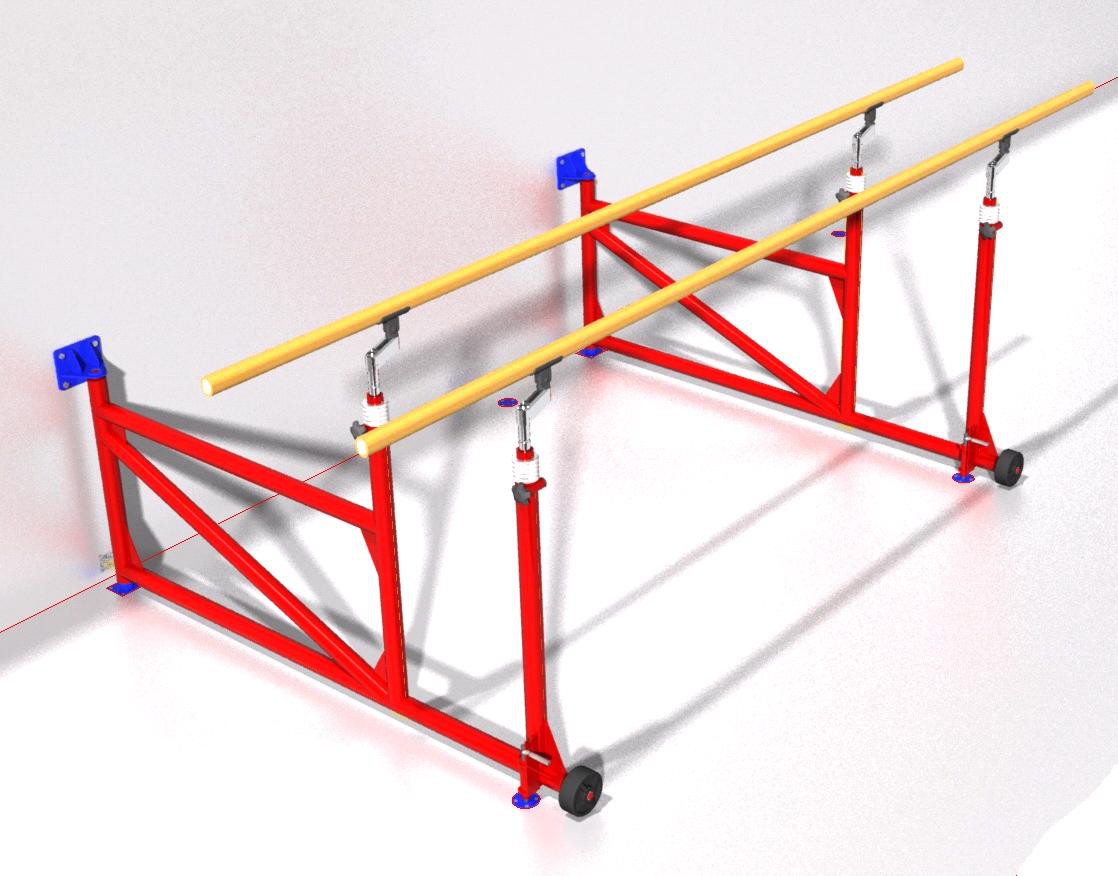 Брусья гимнастические пристенные массовые представляют собой сборную металлическую конструкцию. Крепятся к стене на шарнирных соединениях, что позволяет их складывать вдоль стены если они не используются. Для удобства складывания конструкция снабжена колесам которые расположены на ножках. В рабочем положении брусья жестко фиксируются к полу.