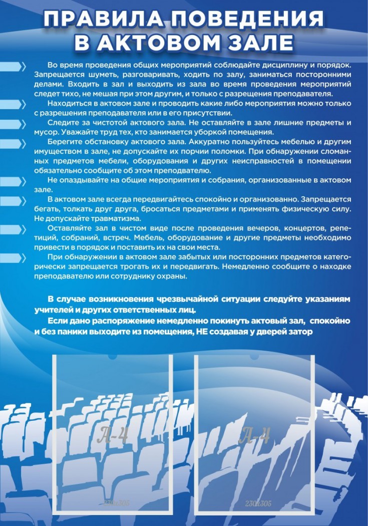 Актовый зал – это всегда скопление большого количества людей. Особенно это заметно, когда основная масса этих людей – дети. Поэтому дисциплину в зале необходимо держать на особом контроле. На данном стенде написаны основные правила поведения в актовом зале, которые являются незыблемыми при проведении любого торжественного мероприятия. Также на стенде есть два карманчика для размещения информации. Их можно использовать как для описания дополнительных правил, так и для объявлений о предстоящих событиях в школе. Стенд изготовлен оптимального размера, чтобы ознакомить всех желающих с информацией.