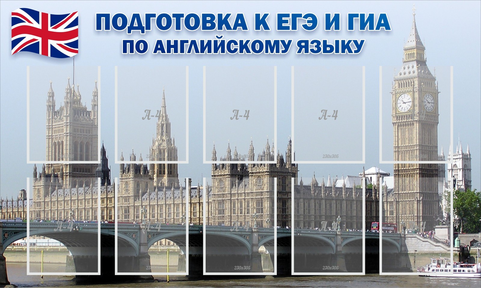 Все больше растет роль английского языка в жизни, и все чаще ученики начинают сдавать экзамены по этому предмету. На фоне Биг-Бена располагаются десять кармашков А4, в которых преподаватель сможет разместить как можно больше информации, которая заинтересует выпускников, сдающих английский язык в качестве экзамена. А фон Биг-Бена будет напоминать о скорых экзаменах. Дизайн стенда подойдет для любого класса. Материал, из которого изготовлен данный стенд, высокого качества, это означает, что стенд прослужит долгие годы. Краска на таком стенде не потускнеет.