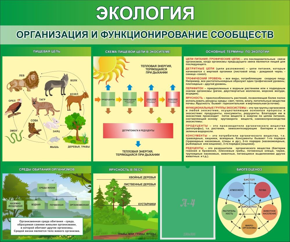Настенный стенд внятно расскажет об основных способах организации и взаимодействия живых сообществ. Пищевая цепь, схема пищевой цепи в экосистеме, среды обитания организмов, ярусность и биогеоценоз. А главное - 9 базовых терминов по экологии, которые должны «отскакивать от зубов» у каждого ученика.