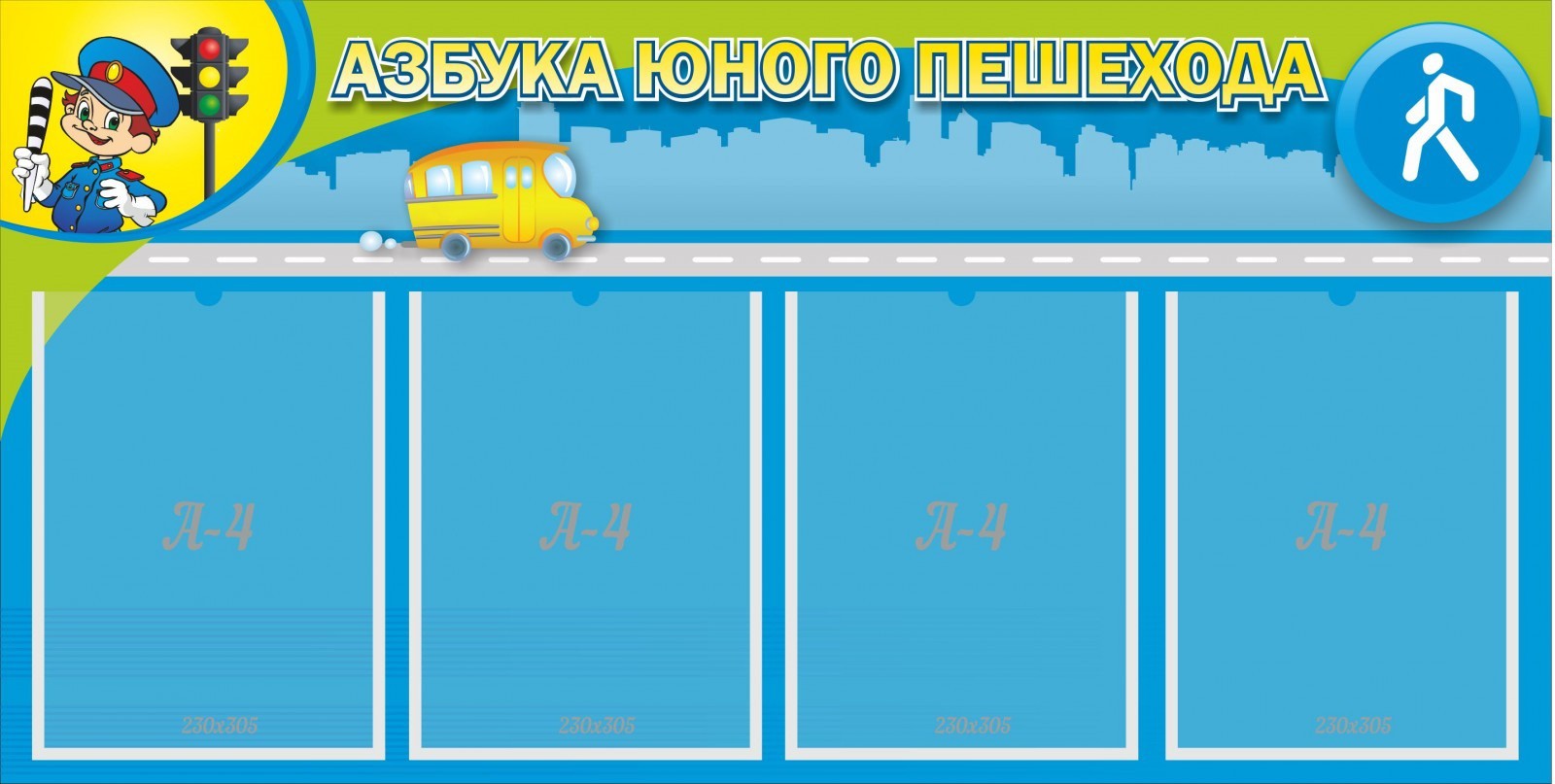Материал, поданный на этом стенде, может рассказать малышам о правилах дорожного движения. Стенд имеет лаконичный дизайн. Информационные карманы расположены на голубом фоне, название – в верхней части стенда. Они отделены друг от друга нарисованной дорогой, по которой едет желтый автобус. Дети увидят не только знакомый им светофор, но и познакомятся с пешеходным знаком. Возможно размещение текстовой информации, а также ее подача в виде тематических картинок. Для изготовления стенда используются только качественные материалы, яркая и стойкая краска, которая не выцветет спустя время.