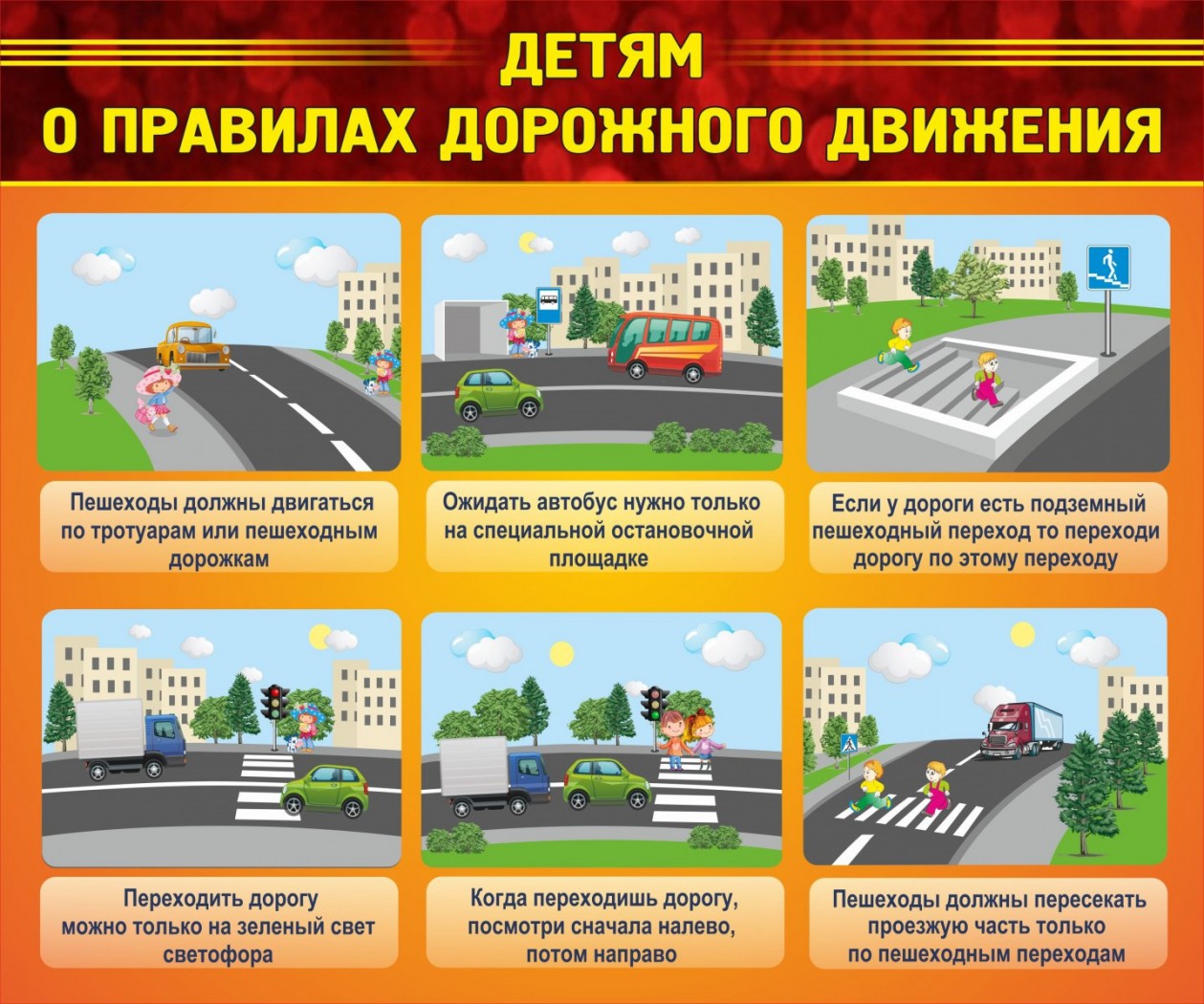 Преимущество данного стенда в качестве используемых материалов и его информационной насыщенности. Подрастая, дети начинают знакомиться с дорогой. Поэтому, важно с раннего возраста обучать детей правилам дорожного движения. Стенд имеет заголовок и тематические картинки. Заголовок занимает 1/5 часть самого стенда, имеет красивые бордовый фон и по три полосы желтого цвета с каждой стороны. Буквы крупные, выполнены в желтом цвете. В информационной части расположились 6 тематических картинок. Этот блок имеет оранжевый фон. Каждая из картинок рассказывает об определенной ситуации. Под ней имеется описание правил дорожного движения.