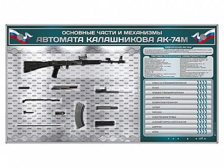 Электрифицированный стенд "Основные части и механизмы автомата Калашникова АК-74М" с полноразмерными, оригинальными макетами деталей и механизмов под стеклом