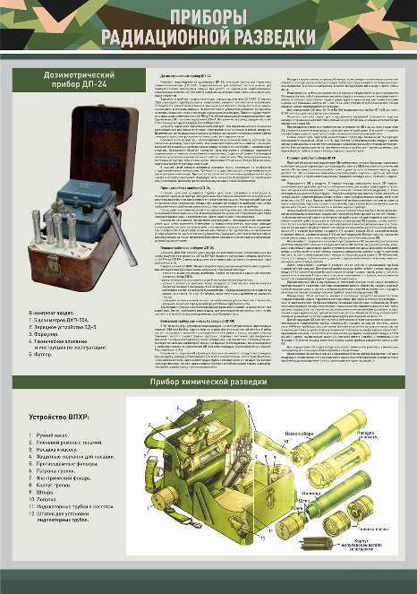 Стенд предназначен для наглядного отображения информации о приборах радиационной и химической разведки, их составе и особенностях эксплуатации, а также для приобретения учащимися или курсантами знаний, необходимых для быстрого выявления опасности при помощи приборов, оценки обстановки и принятия соответствующих мер по обеспечению безопасности в условиях заражения.