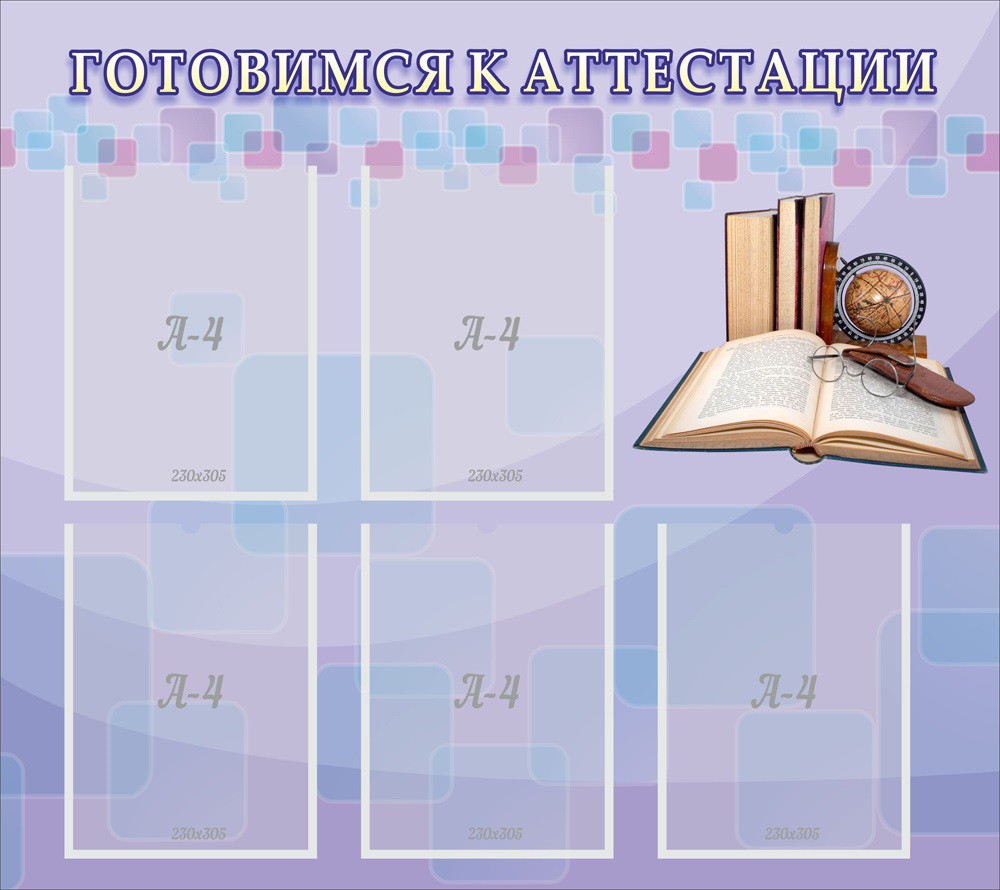 Красивый стенд «готовимся к аттестации» прекрасно сочетает в себе голубые и сиреневые цвета, выполненные в бледных тонах. Оригинальный рисунок с книгами и глобусом станет прекрасным украшение учительской. Стенд изготовлен из высококачественного пластика ПВХ, который имеет толщину всего 3 мм. Такой стенд имеет небольшой вес, поэтому очень удобен в транспортировке и установке. На данной модели стенда можно разместить пять листов А4, которые помещаются в карманы с ламинирующей пленкой. При замене необходимого листа не возникнет проблем, так как ламинирующая пленка имеет отогнутый правый уголок.