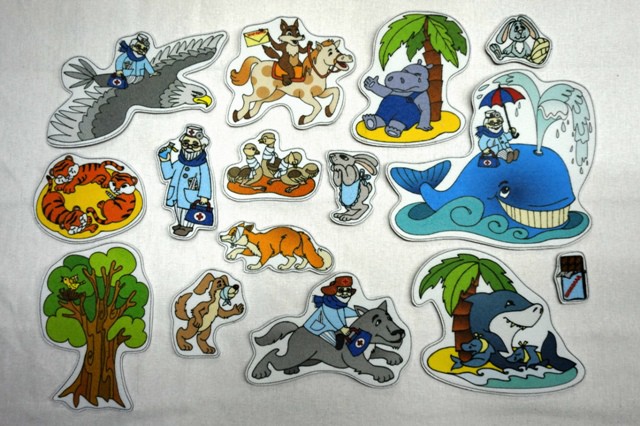 Набор иллюстрирует детскую сказку в стихах Корнея Чуковского «Доктор Айболит». Каждая фигура снабжена липучкой (лентой Velcro). Данный набор подходит для работы с игровым полем.