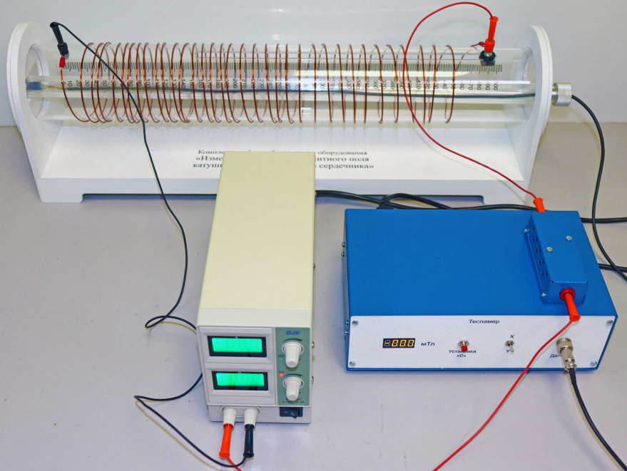 Комплект учебно-лабораторного оборудования предназначен для проведения лабораторно-практических занятий по дисциплине "Физика: электричество и магнетизм" с целью изучения зависимости индукции магнитного поля катушки индуктивности от силы тока и длины катушки.