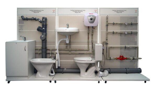 Все модули в стенде соединены между собой системой водоснабжения, системой канализации и представлять собой цельный стенд для проведения монтажных работ. Стенд имеет функцию подключения к центральному водоснабжению учебного заведения, также реализована функция подключения к центральной канализации.