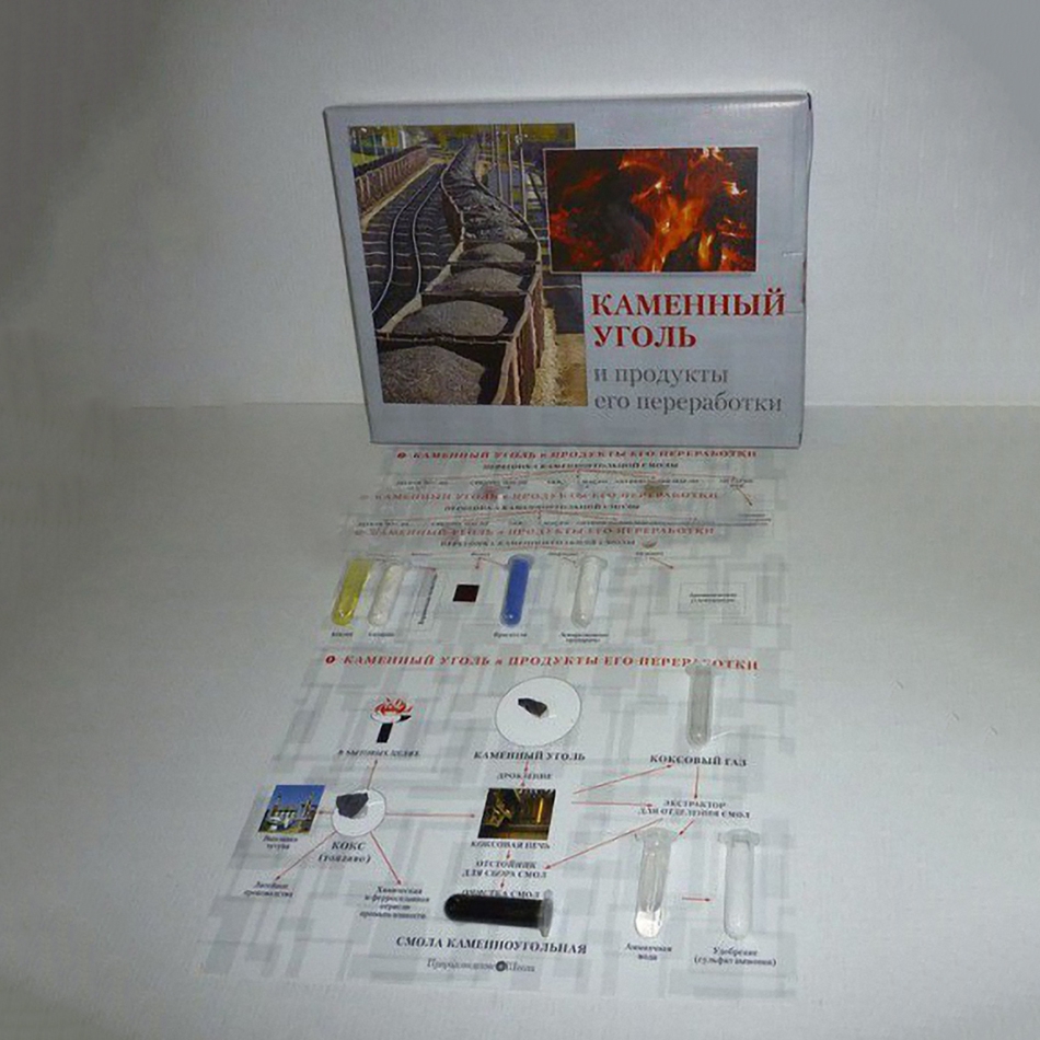 В комплект входят 15 планшетов формата А4, покрытых ламинирующей пленкой,  с  наклеенными на них образцами. На каждом планшете размещены 14 пробирок  с продуктами переработки каменного угля и два натуральных образца – каменный уголь и кокс. Ядовитые и вредные вещества в пробирках имитированы.