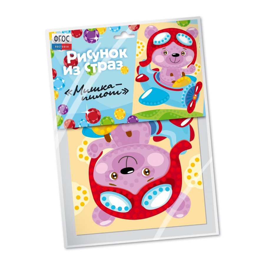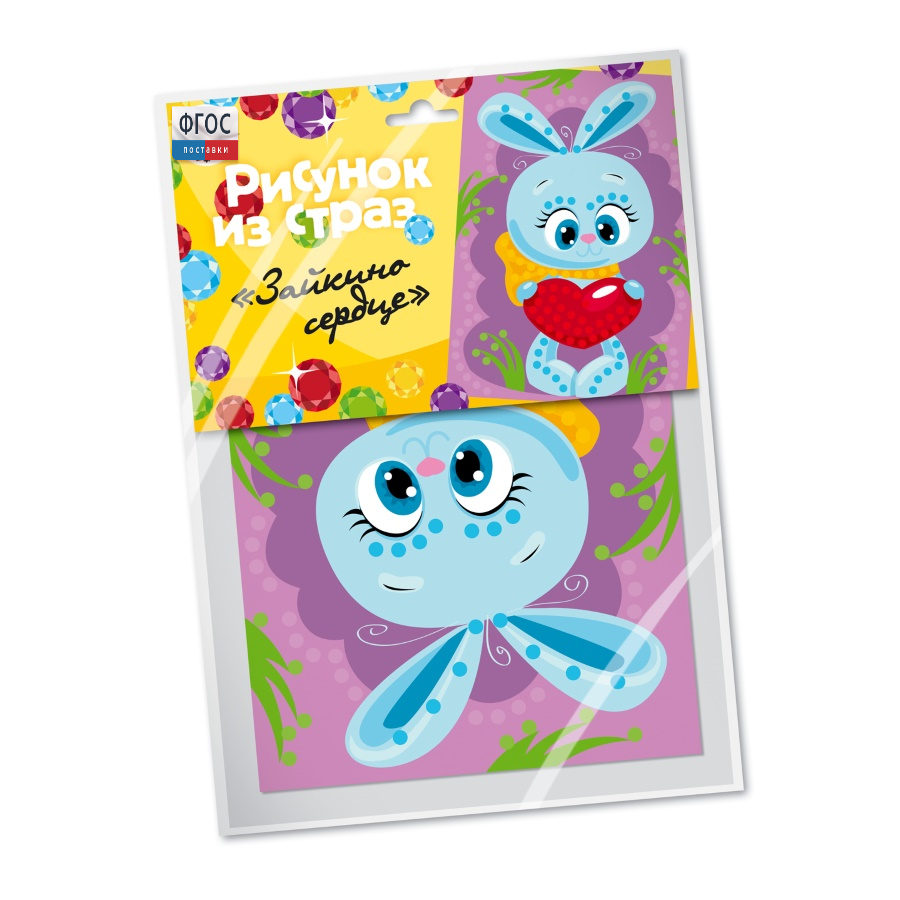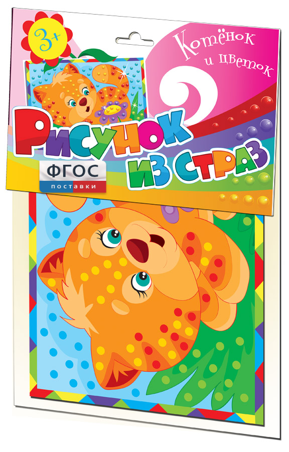 В комплект входит 3 набора. В состав каждого набора входит: самоклеющиеся стразы размером 6 мм (разных цветов), картонная основа с рисунком 25х18 см.